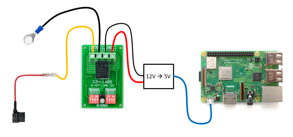 There are plenty of options for powering this thing, but the simplest option is to take a tap off a 12V supply somewhere convenient. Obviously, your Pi runs off 5V not 12V so you'll need a step-down converter (aka "buck") and there are lots of them available on Amazon and eBay. DROK is a reliable brand. Get one that can supply at least 3A at 5V so it isn't struggling or getting hot. Get one with a MicroUSB connector on the end to make life easier.