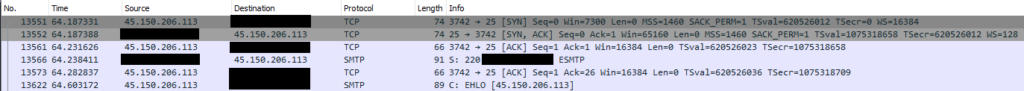 [1:2260002:1] SURICATA Applayer Detect protocol only one direction [**] [Classification: Generic Protocol Command Decode] [Priority: 3] {TCP} XXX.XXX.XXX.XXX:25 -> 45.150.206.119:64369So who is 45.150.206.119 and what are they doing to the SMTP port on my server?